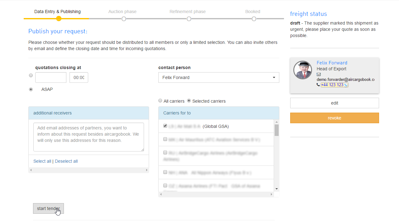 After having created a quotation request, we will present to you all airlines that are suitable to handle your request and potential shipment. From our selection tool, you can choose to send your request to all airlines that can handle your request, pre-selected group of airlines (preferred carriers) or just to one.